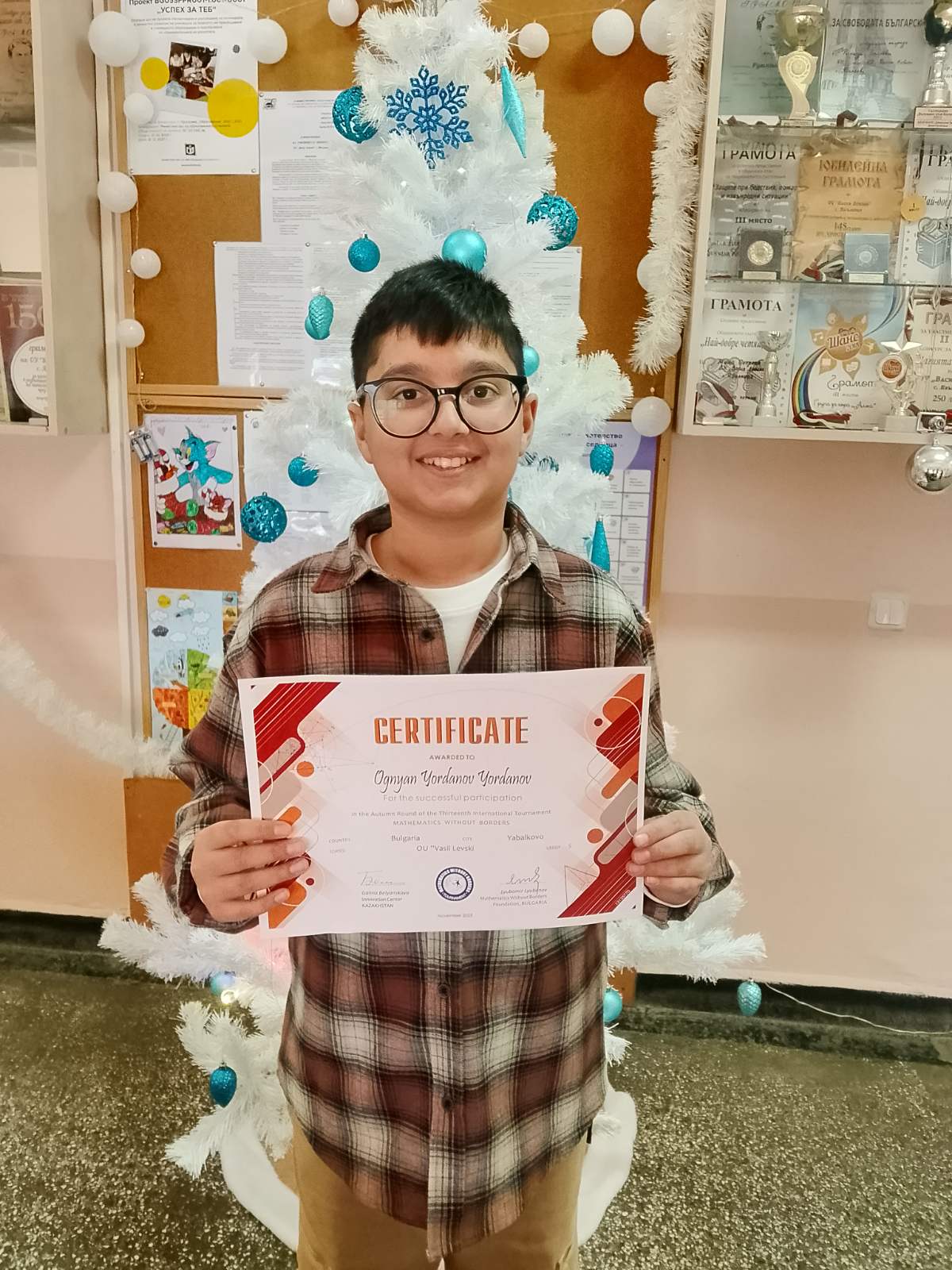 С постоянство и любов към математиката, Йордан Йорданов от 5 клас се представи чудесно на Международното състезание „Математика без граници“.